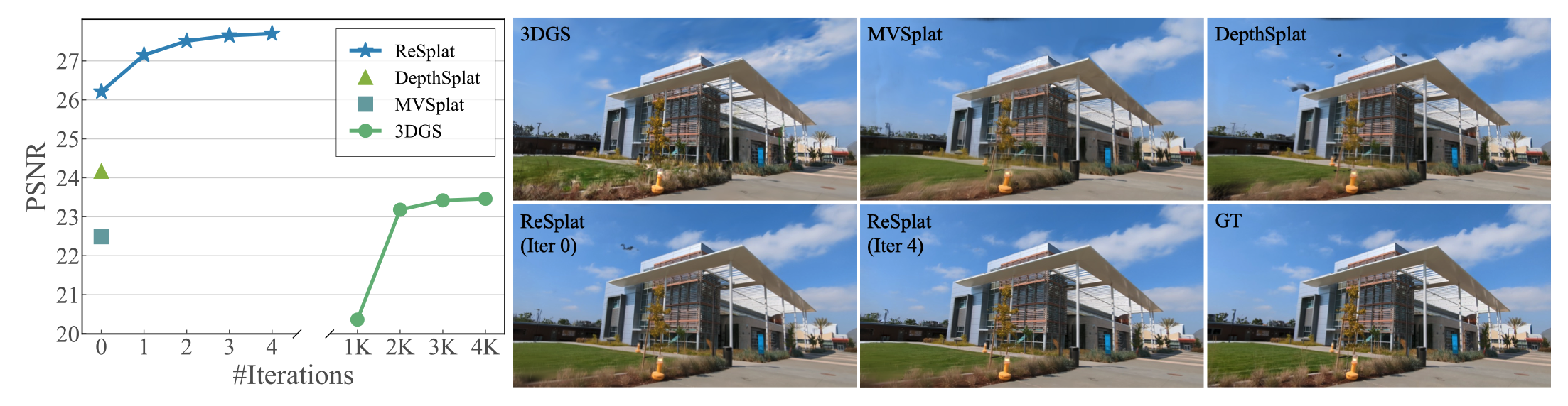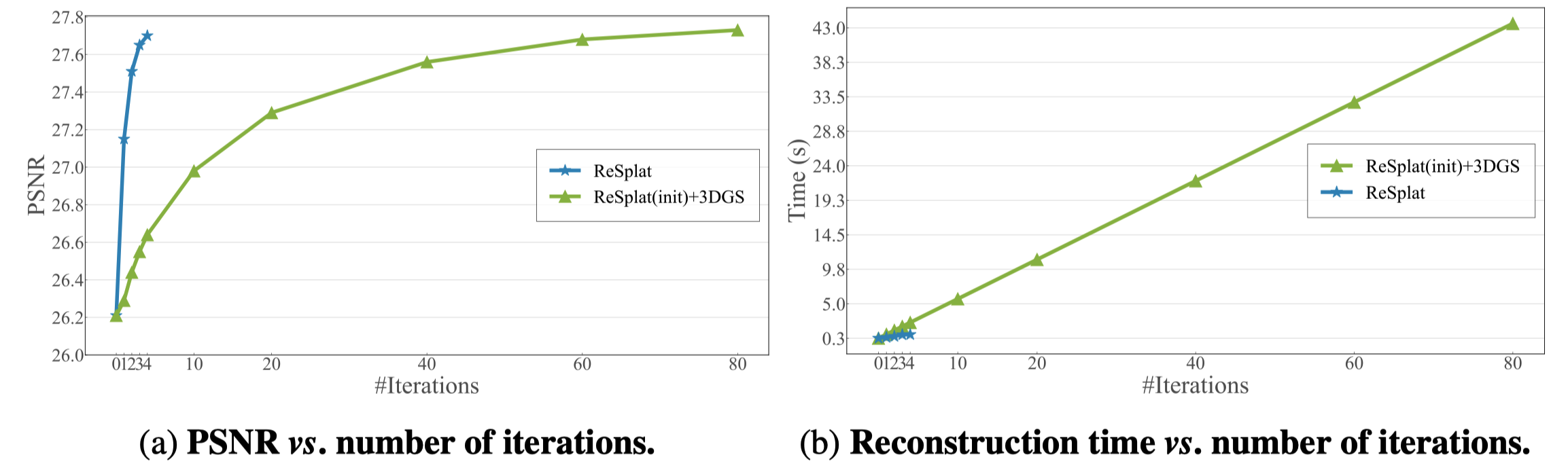 Starting from the same ReSplat's initialization, we compare 3DGS optimization-based refinement with our feed-forward approach. Our ReSplat improves the rendering quality significantly faster (4 vs. 80 iterations) and is 53x faster in terms of the reconstruction speed.